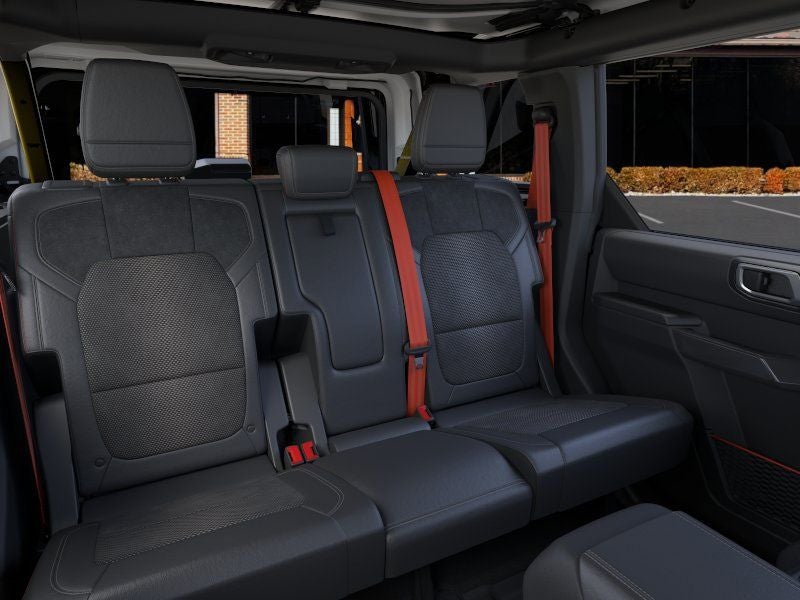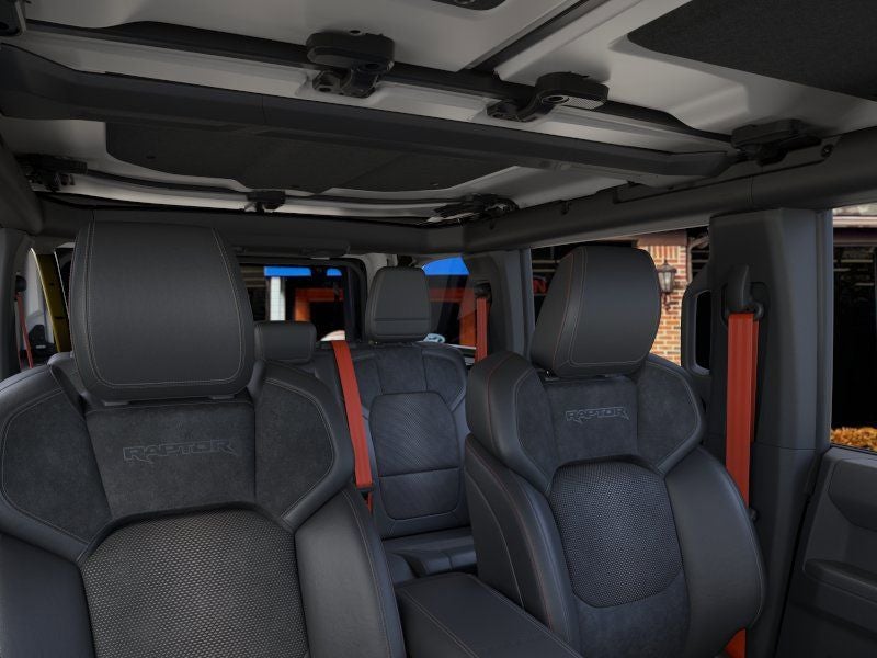 - The 2025 Ford Bronco Raptor is built for extreme off-road performance with rugged style to match. This four-door 4x4 is finished in bold Shelter Green and powered by a 3.0L EcoBoost V6 engine paired with a 10-speed automatic transmission. Inside, the Onyx leather-trimmed and suede seats, accented by Code Orange seat belts and an interior carbon fiber package, bring a premium, performance-inspired feel. The Raptor Black Appearance Package adds 17-inch black forged beadlock-capable wheels, 37-inch all-terrain tires, blackout graphics, and black-painted fender flares. Engineered for adventure, it features advanced 4x4 capability with front and rear locking differentials, a front stabilizer bar disconnect, HOSS 4.0 suspension with FOX Live Valve dampers, and full metal bash plates. Convenience and technology highlights include a 12-inch LCD touchscreen, 360-degree camera, digital instrument cluster, and the LUX Package for added comfort and connectivity. From its heavy-duty modular front bumper with Rigid fog lamps to its reinforced swing gate and rock rails, the Bronco Raptor is designed to conquer any terrain in confidence and style.