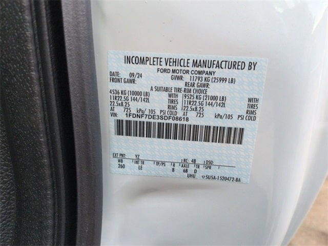 Check out all of the features on this 2025 Ford F-750SD Exterior Appearance Group (Chromed Fender Badge), Preferred Equipment Package 600A (Body Builder Wiring - At Back of Cab, Combined, Engine Exhaust Brake, Four Body Builder Switches - Mounted in Center Instrument Panel, Intelligent Oil Life Monitor, Lights - Roof Marker/Clearance - Amber Lenses, 5 Lights, Manual Regen Initiation - Driver Interface in Message Center, and Steering Column - Tilt / Telescoping), 2D Standard Cab, V8, 10-Speed Automatic, RWD, Oxford White, STEEL GRAY VINYL, 6.17 Axle Ratio, Engine Block Heater, Phillips, 120 Volt/750 Watt, 110 A/C Outlet - in Lower Center Finish Panel, 2 Speakers, ABS brakes, Air Conditioning, AM/FM radio, Body Builder Wiring - At End of Frame, Combined - (ILO Standard - Back of Cab Combined), Delay-off headlights, Driver's Seat Mounted Armrest, Dual rear wheels, Electronic Stability Control, Front reading lights, Front Stabilizer Bar, Fully automatic headlights, Heated door mirrors, Jump Start Stud - Remote Mounted, Lube, Front Axle, EmGard 50W, Synthetic Oil, Lube, Rear Axle, EmGard 75W-90, Synthetic Oil, Passenger seat mounted armrest, Passenger vanity mirror, Power steering, SecuriLock Passive Anti-Theft System, Shock Absorbers, Rear - Double Acting, Speed control, Speed-Sensitive Wipers, Steering wheel mounted audio controls, Tachometer, Telescoping steering wheel, Tilt steering wheel, Traction control, Trip computer, and Variably intermittent wipers. Buyer must qualify for all rebates listed. Price includes: $750 - Always On ICI RCL Renewal. Exp. 03/31/2026