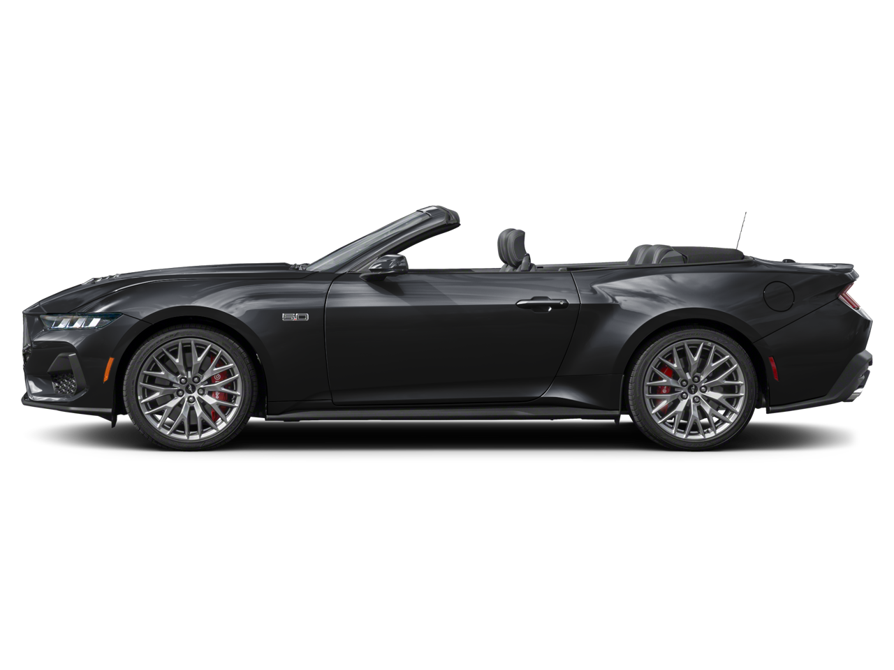 - The 2025 Ford Mustang GT Premium Convertible is the ultimate blend of power, style, and advanced technology. Finished in sleek Shadow Black, this four-passenger sports car commands attention with its bold Mustang Nite Pony Package, featuring 19-inch Ebony Black-painted aluminum wheels, a distinctive blade spoiler, and striking red Brembo brake calipers with white logos. Under the hood, the legendary 5.0L Ti-VCT V8 engine delivers thrilling performance, paired with a smooth 10-speed automatic transmission and a 3.55 ratio limited-slip axle for enhanced control and acceleration. The active valve exhaust system ensures an exhilarating sound that matches the Mustangs power. Inside, the Black Onyx leather-trimmed interior offers premium comfort and modern sophistication. The cabin is equipped with a 12.4-inch digital instrument cluster and a 13.2-inch LCD center stack screen, providing seamless access to SYNC 4 infotainment and FordPass Connect with 4G Wi-Fi. Enjoy an immersive audio experience with the premium B&O 12-speaker sound system, while ambient lighting with MyColor customization sets the perfect mood. Advanced technology enhances both safety and convenience, with features like Ford Co-Pilot360 Assist+, intelligent access with push-button start, selectable drive modes, and rain-sensing wipers. Rear parking sensors, a rearview camera, and the security package add peace of mind, ensuring a confident driving experience. Designed for those who crave performance and luxury, the 2025 Mustang GT Premium Convertible is a true modern muscle car built to turn heads and deliver an unforgettable driving experience.