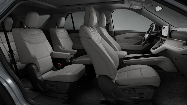 - Experience premium comfort and cutting-edge technology in the 2026 Ford Explorer Platinum. Finished in a stunning Space White Metallic exterior, this four-wheel drive SUV delivers a refined and capable drive powered by a 2.3L EcoBoost I-4 engine paired with a 10-speed automatic transmission. The Explorer Platinums elegant design features unique satin chrome accents, adaptive LED headlamps, rain-sensing wipers, a satin-finish grille, and 21-inch ultra-bright machined wheels that give it a commanding presence on the road. Inside, the cabin surrounds you in luxury with Crystal Gray leather-trimmed seating, heated and ventilated multicontour front seats with Active Motion, and heated second-row seats for total passenger comfort. A panoramic moonroof fills the interior with natural light, while ambient lighting and a heated leather-wrapped steering wheel elevate every drive. Convenience and innovation take center stage with a 12.3-inch digital cluster, a 13.2-inch touchscreen, and the Ford Digital Experience featuring Google Maps and Play Store integration. Stay connected and confident with the B&O 14-speaker sound system, 5G modem, wireless Apple CarPlay and Android Auto, and Ford Co-Pilot360 Active 2.0 with BlueCruise hands-free driving capability. Additional features such as a 360-degree camera, PowerFold third-row seats, remote start, and a universal garage door opener ensure every journey is as effortless as it is enjoyable. With its perfect blend of sophistication, power, and advanced technology, the 2026 Ford Explorer Platinum stands ready to elevate every adventure.