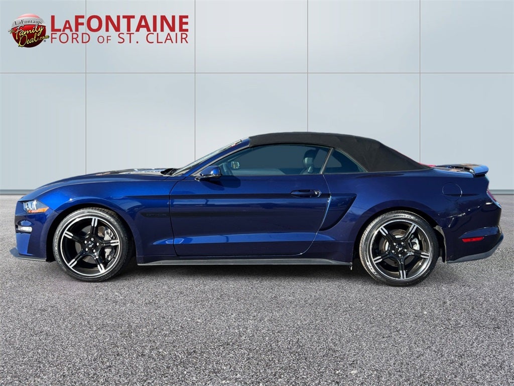 2019 Ford Mustang GT Premium Experience open-air performance in this 2019 Ford Mustang GT Premium Convertible, finished in striking Kona Blue Metallic with a fully lined cloth top that drops at the push of a button. Built at Ford’s Flat Rock Assembly Plant, this four-passenger sports car blends iconic muscle car heritage with modern technology and premium comfort. Under the hood, the legendary 5.0L Ti-VCT V8 delivers exhilarating power, paired with a responsive 10-speed automatic transmission for smooth acceleration and confident highway cruising. A 3.55 ratio limited-slip rear axle and Active Valve Performance Exhaust elevate the driving experience, giving you the perfect balance of everyday drivability and throaty V8 performance when you want it. Selectable Drive Modes and Track AppsTM allow you to tailor the Mustang’s personality to match your mood, whether you’re carving corners or cruising with the top down. This GT Premium stands out even further with the California Special Package, featuring 19-inch machined-face high-gloss black wheels, distinctive side striping, a pedestal rear spoiler, and unique California Special floor mats. Hood vents, LED headlamps with signature lighting, LED fog lamps, quad-tip dual exhaust, and signature Pony projection lamps complete its unmistakable presence. Inside, the Ebony leather-trimmed interior with red accent stitching creates a bold, performance-inspired cockpit. A 12-inch LCD digital instrument cluster keeps key driving information front and center, while ambient lighting, dual-zone electronic automatic climate control, and a leather-wrapped steering wheel enhance everyday comfort. The Premier Trim with Color Accent Group adds refined details, complemented by premium floor mats and front and rear premium floor liners for added protection. Technology is seamlessly integrated with SYNC® 3 featuring an 8-inch touchscreen and AppLink®, voice-activated navigation, FordPass ConnectTM with 4G Wi-Fi capability, and a 12-speaker B&O® Premium Sound System for an immersive audio experience. Intelligent Access with push-button start, a universal garage door opener, and global open windows add convenience at every turn. Safety and confidence come standard with BLIS® (Blind Spot Information System) with Cross-Traffic Alert, a rearview camera, reverse sensing system, AdvanceTrac® electronic stability control, and an enhanced security package. With its bold styling, premium features, and unmistakable V8 performance, this 2019 Mustang GT Premium Convertible delivers the thrill of classic American muscle with the refinement and technology today’s drivers expect., California Special Instrument Panel Applique Badge, California Special Package, California Special Script Rear Badging, Equipment Group 401A, Floor Mats w/Red Contrast Stitching, Leather Bucket Seats w/Color Accents, Leather-Trimmed Bucket Seats w/Miko Suede Inserts, Miko Suede Door Inserts w/Red Contrast Stitching, Pedestal Rear Spoiler, Unique Front Grilles w/Offset Tri-Bar Pony Logo, Wheels: 19 x 8.5 Machined-Face Aluminum.