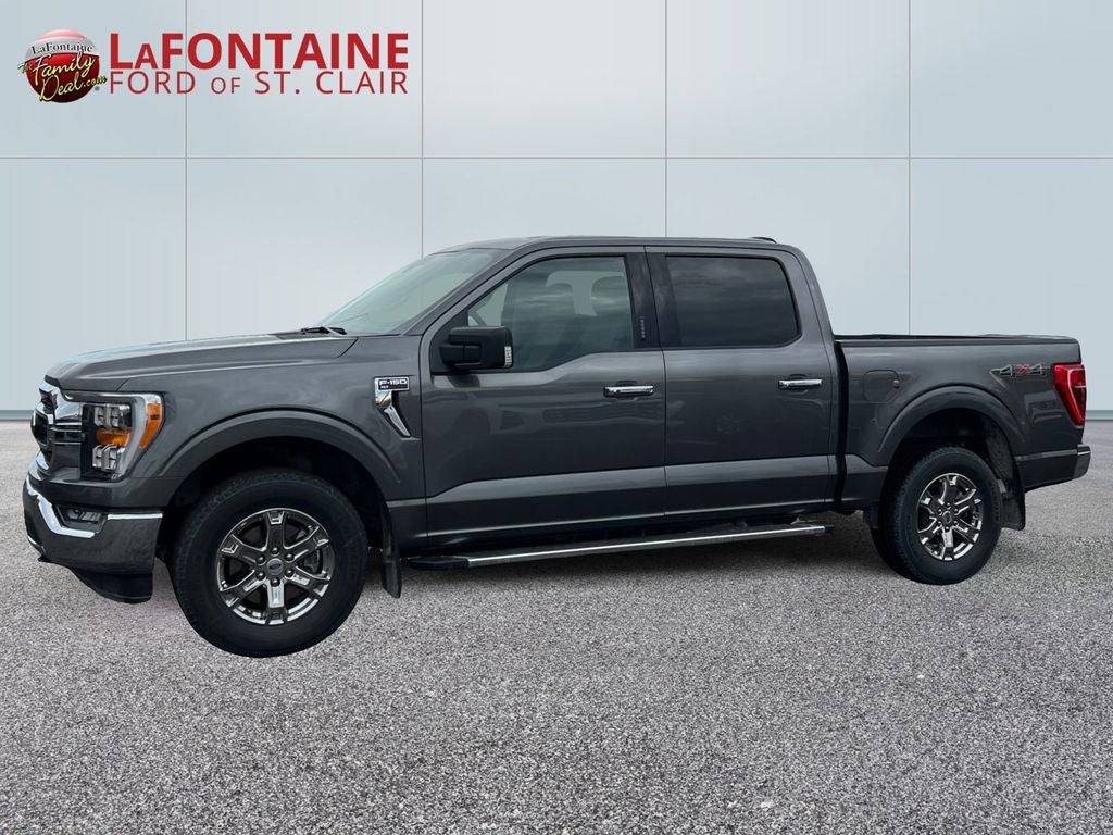 - This 2022 Ford F-150 XLT SuperCrew 4x4 is a sharp, capable full-size truck finished in Carbonized Gray Metallic with a Dark Slate cloth interior. Built on a 145-inch wheelbase, this F-150 combines bold styling, everyday comfort, and serious utility, making it an excellent choice for work, towing, or family use. The XLT Chrome Appearance Package adds extra curb appeal with 18-inch chrome-like PVD wheels, bright polished step bars, and a refined exterior presence. Power comes from the efficient and responsive 2.7L EcoBoost V6 engine paired with an electronic 10-speed automatic transmission, delivering strong acceleration and confident towing capability. Equipped with a Class IV trailer hitch, integrated trailer brake controller, Dynamic Hitch Assist, trailer sway control, and selectable 4x4 shift-on-the-fly, this truck is ready to handle trailers, boats, campers, and changing road conditions with ease. Inside the cabin, you’ll find a spacious SuperCrew layout with comfortable seating and smart technology throughout. Features include dual-zone electronic automatic temperature control, remote start, a power-sliding rear window, SYNC 4 with enhanced voice recognition, built-in navigation, SiriusXM with 360L, and a premium B&O 8-speaker sound system for an upgraded driving experience. The fold-up rear bench seat adds flexible cargo and passenger space when needed. Safety and driver-assist features include BLIS with Cross-Traffic Alert, Lane-Keeping System, Pre-Collision Assist with Automatic Emergency Braking, Reverse Brake Assist, rear parking sensors, a rearview camera, AdvanceTrac with Roll Stability Control, and post-collision braking. Practical features continue in the bed with the Bed Utility Package, which includes BoxLink cargo management, LED box lighting, tailgate step, tie-down hooks, and a drop-in bedliner to help protect the truck bed from daily use. With strong capability, modern technology, and rugged good looks, this 2022 Ford F-150 XLT is a well-equipped truck ready for whatever comes next.