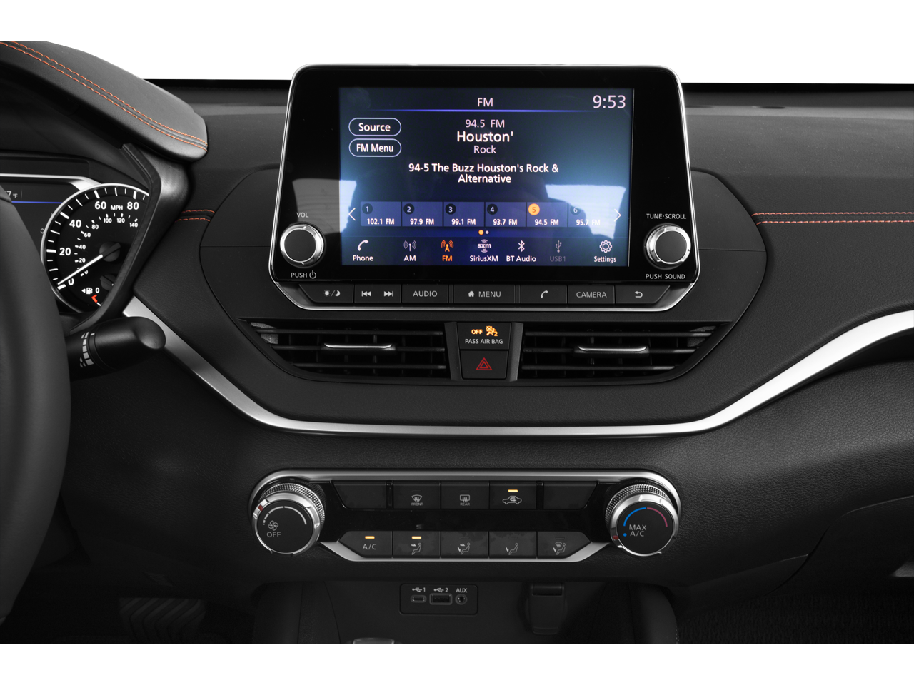 - Radio: AM/FM Audio System -inc: 6 speakers, aux input, NissanConnect featuring Apple CarPlay, Android Auto, 8" color touch-screen display, 1 front illuminated USB port (type-C) for compatible devices, SiriusXM radio w/advanced audio features, Bluetooth hands-free phone system, streaming audio via Bluetooth, hands-free text messaging assistant, 2 rear illuminated USB ports (type-A, 1 type-C) for compatible devices, Siri Eyes Free and Google Assistant voice recognition