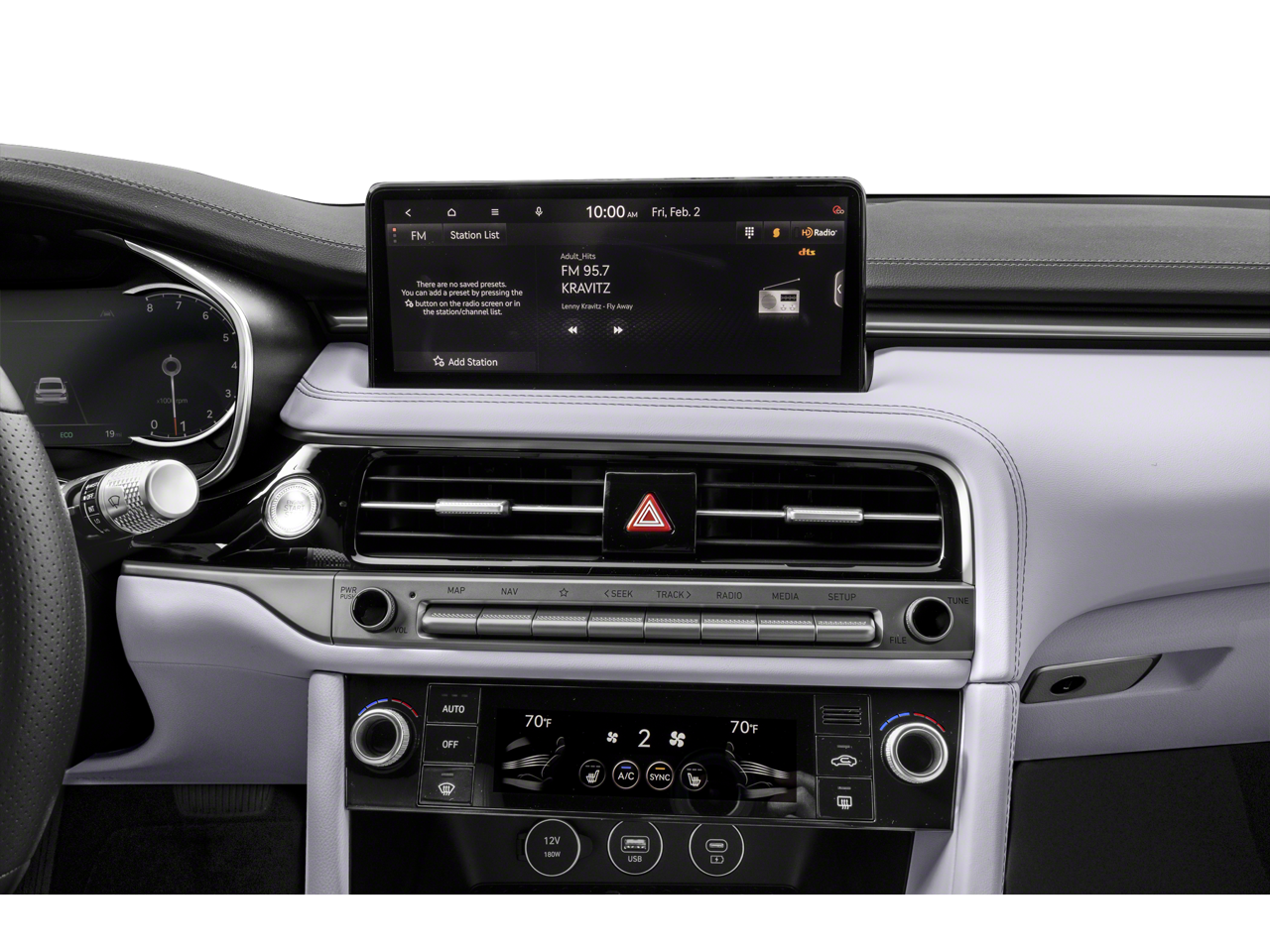 - Radio: AM/FM/SiriusXM/HD Audio System -inc: 6 speakers, 5th generation navigation system w/10.25" touchscreen, dynamic voice recognition, connected routing, over the air updates, Android Auto and Apple CarPlay, SiriusXM Radio w/90-day trial subscription (not available in Alaska or Hawaii), Genesis connected services, Bluetooth hands-free phone and audio streaming system