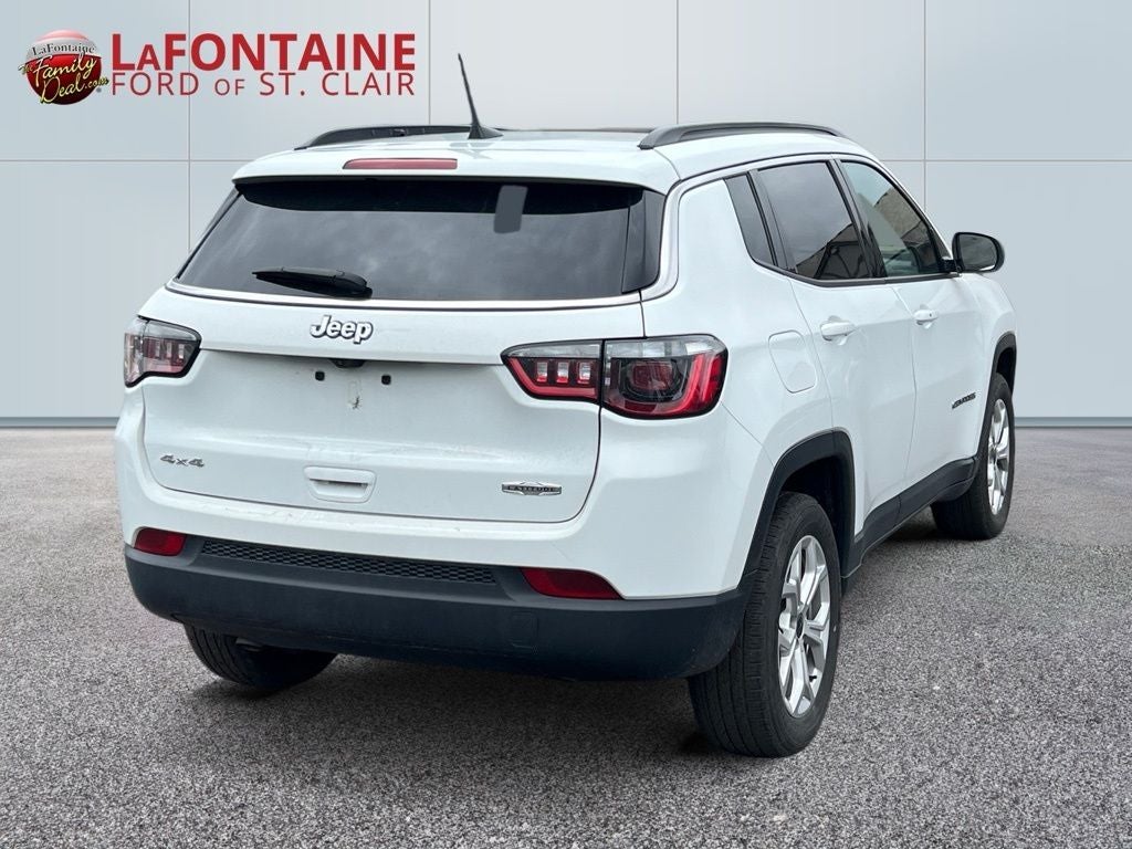 - This 2025 Jeep Compass Latitude 4x4 is a well-equipped compact SUV that blends everyday comfort with confident capability. Finished in Bright White Clear-Coat with a sleek black interior, it features premium cloth and vinyl bucket seats that offer both durability and comfort for daily driving or weekend adventures. Under the hood, the Compass is powered by a responsive 2.0L turbocharged engine paired with an 8-speed automatic transmission, delivering a smooth and efficient driving experience. With Jeep’s Selec-Terrain® system and 4x4 capability, this SUV is ready to handle changing road conditions with confidence—whether you're navigating Michigan winters or heading off the beaten path. Safety is a strong focus, with advanced features including Full-Speed Forward Collision Warning Plus, Blind-Spot and Cross-Path Detection, Active Lane Management, and Pedestrian/Cyclist Emergency Braking. Additional driver-assist technologies like Drowsy Driver Detection and a ParkView® Rear Back-Up Camera help provide added peace of mind on every drive. Inside, the cabin is designed with comfort and convenience in mind. Heated front seats and a heated steering wheel make colder days more enjoyable, while the Uconnect® 5 system with an 8.4-inch touchscreen keeps you connected with Apple CarPlay® and Android Auto™. Multiple USB ports, steering wheel-mounted controls, and a 6-speaker audio system add to the everyday usability of this Compass. This Latitude is also equipped with the Sun and Sound Group, featuring a dual-pane panoramic sunroof that fills the cabin with natural light and a premium Alpine® sound system for an elevated listening experience. The Convenience Group adds thoughtful upgrades like dual-zone automatic climate control, an 8-way power driver’s seat with lumbar support, a power liftgate, and a foot-activated Open ‘N Go liftgate for easy access when your hands are full. On the exterior, LED reflector headlamps, fog and cornering lamps, black side roof rails, and heated power mirrors enhance both style and functionality. With its well-rounded feature set, modern technology, and versatile capability, this 2025 Jeep Compass Latitude 4x4 is ready to fit seamlessly into your lifestyle.